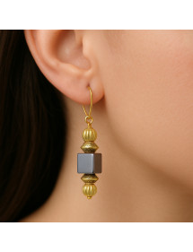 Ces boucles d’oreilles associent l’intensité métallique de l’hématite naturelle à la chaleur du doré. Les cubes d’hématite, encadrés de perles cannelées et d’intercalaires ciselés, composent une harmonie lumineuse et équilibrée. Les petites créoles dorées ajoutent une touche de raffinement discret, parfaite pour sublimer une tenue élégante ou contemporaine. Chaque paire est façonnée à la main dans notre atelier d’Anjou, gage d’un savoir-faire artisanal français alliant qualité et originalité. Longueur totale : 50 mm. Composition : cubes d’hématite naturelle du Brésil, perles cannelées et intercalaires en laiton doré, monture sur petites créoles en acier inoxydable plaqué or. Bijou de fabrication artisanale française, assemblé avec soin dans notre atelier en Anjou.