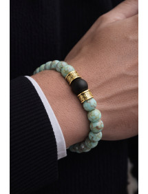 Très beau bracelet pour homme fabriqué avec soin dans nos ateliers en France. Ce bracelet est composé de magnifiques perles naturelles en turquoise, de perles d'Agate noire et de très jolies perles tibétaines en laiton couleur dorée. C'est la force du métal qui transparaît dans ce modèle. Style : Ethnique, Bohême, tribal, zen Longueur : 210 mm Perles : 10 mm et 12 mm Matériaux : turquoise naturelle (pierre semi-précieuse), agate noire laiton Couleur : vert, noir Couleur du métal : Doré