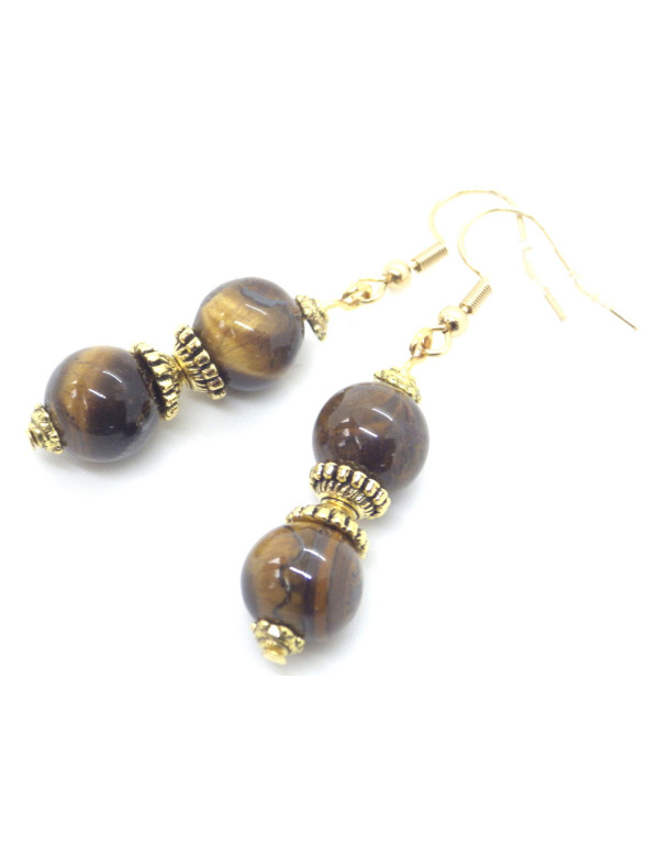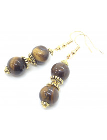 Magnificent artisanal creation presented by ThurColas Creation, these are earrings made of natural brown Tiger's eye pearls (semi-precious stone) embellished with Tibetan pearls and gold metal cups. Everything is mounted on gold-plated stainless steel French hooks. Style: Classic, chic, Ethnic, Bohemian Hook: French Height: 50 mm Beads: 10 mm Materials: brown Tiger's eye (semi-precious stone), stainless steel, gold metal Color: brown Metal color: Gold
