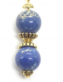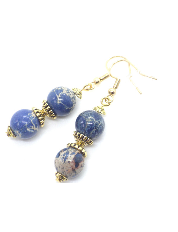 Magnificent artisanal creation presented by ThurColas Creation, these are earrings made of natural pearls in blue imperial jasper (semi-precious stone) embellished with Tibetan pearls and gold metal cups. Everything is mounted on gold-plated stainless steel French hooks. Style: Classic, chic, Ethnic, Bohemian Hook: French Height: 50 mm Beads: 10 mm Materials: blue imperial jasper (semi-precious stone), stainless steel, gold metal Color: blue, white Metal color: Gold Our beads are made of real blue imperial jasper and assembled on a gold metal rod and gold-plated stainless steel hooks, imperial jasper being a natural stone, each bead is unique in color so there may be slight differences with the model presented, each model is in fact unique. This piece of jewelry comes with a free gift bag.