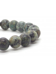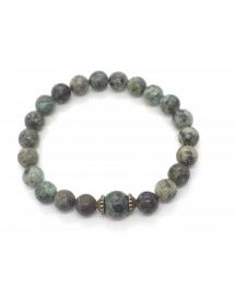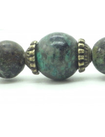 Magnificent artisanal creation presented by ThurColas Creation, this is a women's bracelet made of natural green Turquoise pearls (semi-precious stone) decorated with antique bronze-colored brass cups. Everything is mounted on a quality elastic thread. Style: Classic, chic, Ethnic, Bohemian Length: 19 cm Beads: 10 mm Materials: Green turquoise (semi-precious stone), brass Color: green Metal color: Antique bronze