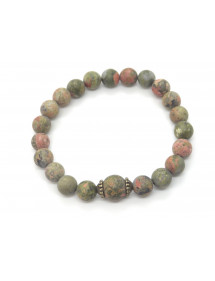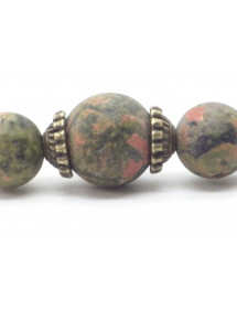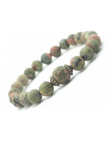 Magnificent artisanal creation presented by ThurColas Creation, this is a women's bracelet made of natural green Unakite pearls (semi-precious stone) decorated with antique bronze-colored brass cups. Everything is mounted on a quality elastic thread. Style: Classic, chic, Ethnic, Bohemian Length: 19 cm Beads: 10 mm Materials: Green unakite (semi-precious stone), brass Color: green Metal color: Antique bronze