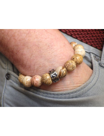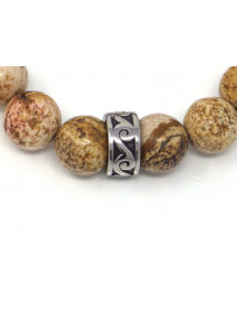 Beautiful brown tribal style bracelet for men made with jasper beads. The dominant color of the bracelet is brown. This bohemian style men's bracelet is embellished with a beautiful central pearl in stainless steel with wave-shaped patterns. The beads are 12 mm in diameter and the bracelet is 21 cm long. Thurcolas is a French creative workshop specializing in the artisanal manufacture of jewelry. All our jewelry, bracelets, earrings, necklaces and anklets are handmade in France with quality materials.