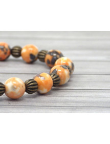 ThurColas offers you a very original handcrafted women's bracelet with a Vintage look made of reconstituted white Jade beads dyed orange and black and with Tibetan bronze beads. As the white Jade beads are randomly dyed there may be slight differences with the model shown in the photograph. The set is mounted on a quality elastic thread and decorated with a Buddha head mounted in Charms. Style: Bohemian Vintage Ethnic tribal Length: 190 mm Beads: 8 mm Materials: Tinted reconstituted white jade bronze Color: Orange black bronze Metal color: Bronze
