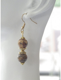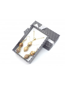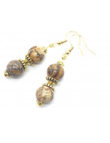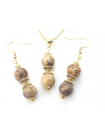 Magnificent artisanal creation presented by ThurColas Création, it is a set of jewelry composed of earrings and a stainless steel necklace with pendants made of natural brown jasper beads (semi-precious stone) decorated with Tibetan beads and gold-plated metal cups. Style: Classic, chic, Ethnic, Bohemian Pendant height: 50 mm Necklace length: 45 cm Earring height: 50 mm Hooks: French Beads: 10 mm Materials: brown jasper (semi-precious stone), gold-plated stainless steel, gold-plated metal Color: brown Metal color: Gold, gold