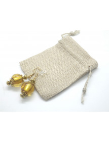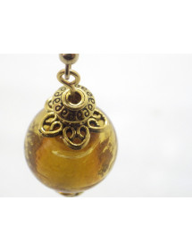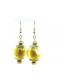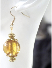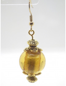 These elegant handmade earrings will add a touch of sophistication to your outfit. Their vintage style, enhanced by a golden lampwork glass bead surrounding a silver leaf, makes them ideal for a special occasion or to add a chic note to your daily wear. Each earring features gold-plated stainless steel hooks, matched with gold brass beads and rods for a harmonious and timeless design. Perfectly balanced with a total height of 50 mm and a pendant of 35 mm, these lightweight and comfortable earrings are designed to be both elegant and easy to wear. This piece of jewelry is the result of French artisanal craftsmanship. Entirely handmade in my workshop, it reflects attention to detail and a passion for creating unique and elegant pieces. A true guarantee of quality and authenticity. Total height: 50 mm Pendant height: 35 mm Bead: 18 mm lampwork glass with silver leaf Hooks: Gold-plated stainless steel Rods and metallic beads: Gilded brass French artisanal craftsmanship