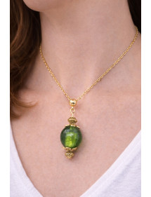 Handmade necklace with a green lampwork glass pendant and gold-plated brass, vintage style, made in France