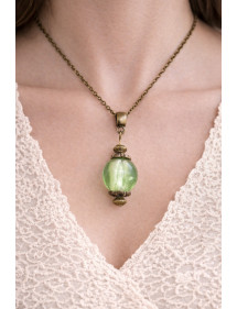 This elegant handcrafted necklace will add a touch of refinement to your outfit. Its vintage style, enhanced by a light green lampwork glass bead surrounding a silver leaf, makes it ideal for a special occasion or to add a chic touch to your daily life. This necklace and its clasp are made of brass, paired with antique bronze brass beads and rods for a harmonious and timeless design. Perfectly balanced with a 45 cm chain and a 35 mm pendant, these lightweight and comfortable earrings are designed to be both elegant and easy to wear. This piece of jewelry is the result of French artisanal craftsmanship. Entirely handmade in my workshop, it reflects attention to detail and a passion for creating unique and elegant pieces. A true guarantee of quality and authenticity. Chain length: 45 cm Pendant height: 35 mm Bead: 18 mm lampwork glass with silver leaf Hooks: Brass Metal rods and beads: Antique bronze brass French artisanal craftsmanship.