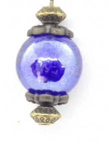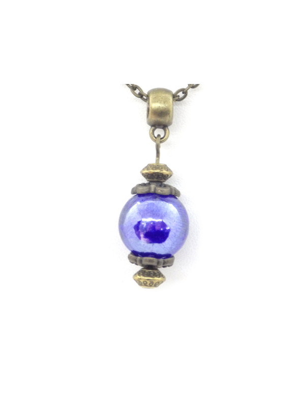 This elegant handcrafted necklace will add a touch of refinement to your outfit. Its vintage style, enhanced by a glossy and pearlescent blue glass bead surrounding a silver leaf, makes it ideal for a special occasion or to add a chic touch to your daily wear. This necklace and its clasp are made of brass, paired with antique bronze brass beads and rods, for a harmonious and timeless design. Perfectly balanced with a 45 cm chain and a 35 mm pendant, these lightweight and comfortable earrings are designed to be both elegant and easy to wear. This piece of jewelry is the result of French artisanal craftsmanship. Entirely handmade in my workshop, it reflects attention to detail and a passion for creating unique and elegant pieces. A true guarantee of quality and authenticity. Chain length: 45 cm Pendant height: 35 mm Bead: 14 mm glazed and pearlescent glass with silver leaf Hooks: Brass Metal stems and beads: Antique bronze brass French artisanal craftsmanship.