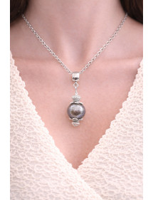Handmade necklace with a brown glazed and pearly glass pendant and silver-plated brass, vintage style, made in France