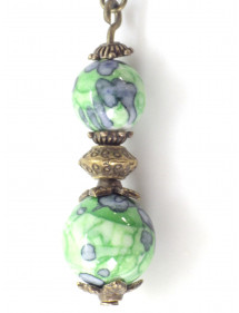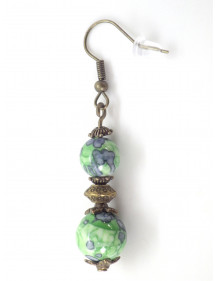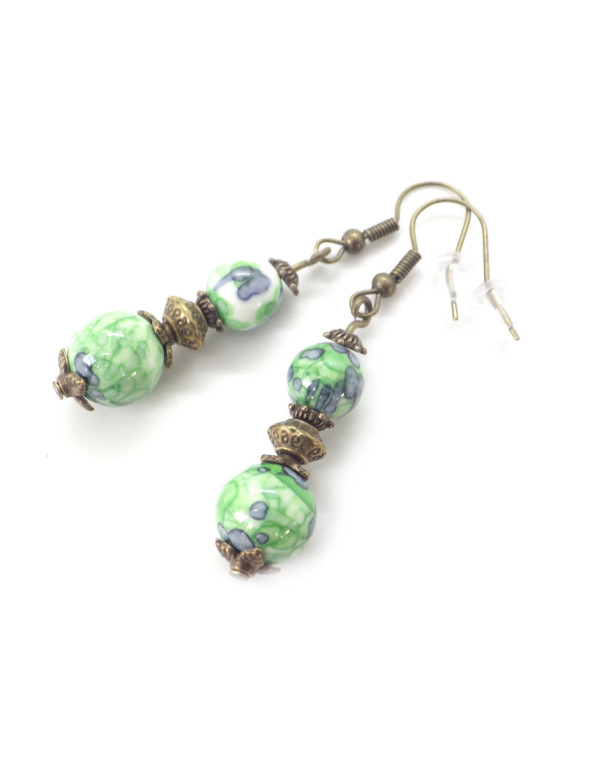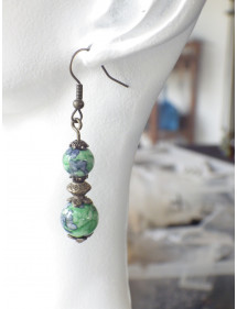 Earrings in green and black tinted white jade beads and antique bronze beads