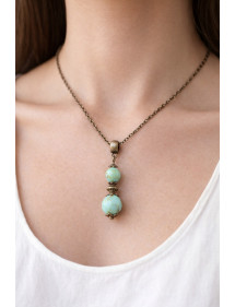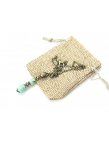 Style: Classic, Chic, Ethnic, Bohemian Pendant Height: 35 mm Necklace Length: 45 cm Beads: 10 mm and 8 mm Materials: Turquoise relocated blue, brass, antique bronze Color: blue Metal color: Antique bronze Our beads used for the pendant of this necklace are made of reconstituted turquoise and assembled on a brass rod the whole is mounted on an antique bronze colored brass chain, the reconstituted turquoise being tinted and marbled randomly, each bead is unique in color so there may be slight differences with the model presented, Each model is therefore unique. This piece of jewelry comes with a free gift bag.
