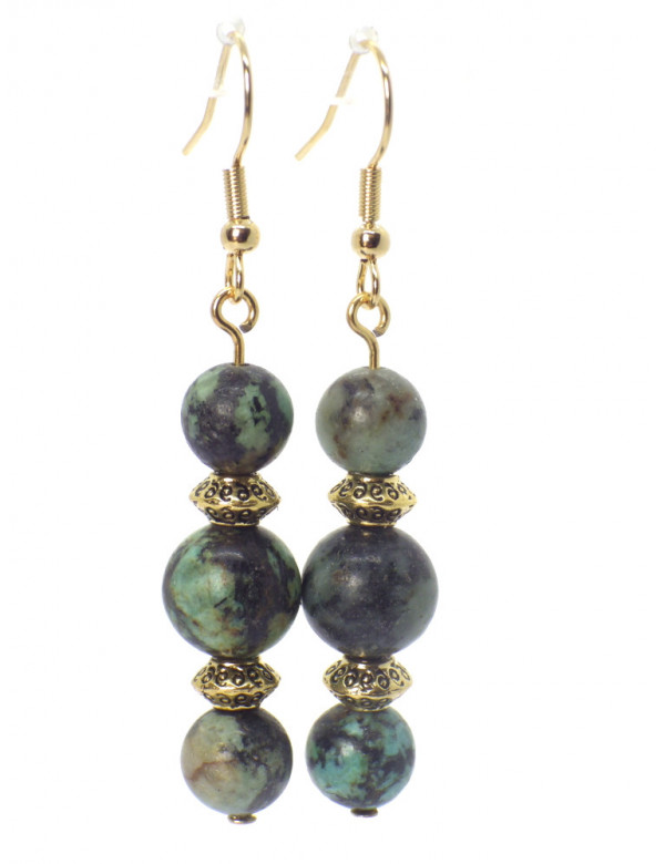 Very beautiful handcrafted earrings presented by ThurColas Création. Very elegant, these earrings are made of green natural turquoise beads (semi-precious stone) and Tibetan beads in gold metal. Everything is mounted on stainless steel hooks. Style: Classic chic, Ethnic, Bohemian Hook: French Height: 55 mm Beads: 10 mm, 8 mm Materials: green natural turquoise (semi-precious stone), metal and golden stainless steel Color: Green Metal color: Gold Our beads are made of green natural turquoise (semi-precious stone) and assembled on a gold metal rod and stainless steel hooks, turquoise is a natural stone, each bead is unique in color so there may be slight differences with the model presented, each model is unique. This piece of jewelry comes with a free gold colored gift pouch.