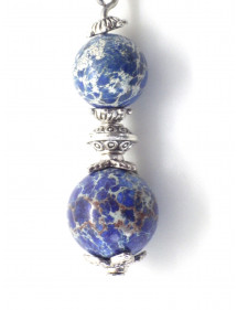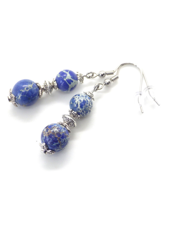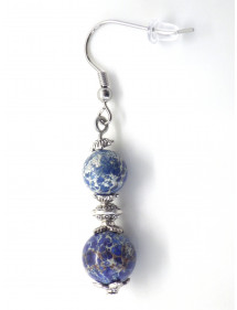 Very beautiful handcrafted creation presented by ThurColas Creation, these are stainless steel earrings made of natural blue imperial jasper beads (semi-precious stone) embellished with Tibetan beads and silver-plated brass beads. The whole thing is mounted on stainless steel French hooks. Perfectly balanced with a total height of 50mm and a 35mm pendant, these lightweight and comfortable earrings are designed to be both stylish and easy to wear. Style: Classic, chic, Ethnic, Bohemian Crochet: French Height: 50 mm Beads: 10 mm and 8 mm Materials: blue imperial jasper (semi precious stone), brass, stainless steel Color: blue, white Metal color: steel, silver