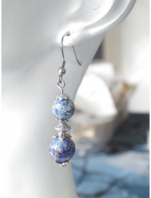 A superb handcrafted creation presented by ThurColas Création, this is a set of jewelry composed of earrings and a stainless steel necklace with pendants made of natural blue imperial jasper beads (semi-precious stone) embellished with Tibetan beads and silver-plated brass cups.