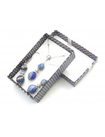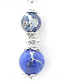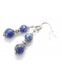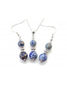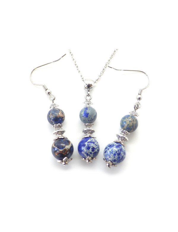 Style: Classic, chic, Ethnic, Bohemian Pendant height: 35 mm Necklace length: 45 cm Height Earrings: 50 mm Hooks: French Beads: 10 mm and 8mm Materials: blue imperial jasper (semi precious stone), silver brass, stainless steel Color: blue, white Metal color: steel, silver Our beads used for the pendants in this jewelry set consisting of a necklace and a pair of earrings are made of real blue imperial jasper and assembled on a brass rod the whole is mounted on a stainless steel chain and hooks, imperial jasper being a natural stone, each bead is unique in color so there may be slight differences with the model presented, Each model is therefore unique. This piece of jewelry comes with a free gift bag.