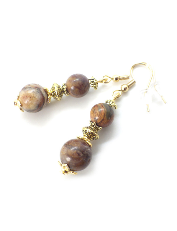 Style: Classic, chic, Ethnic, Bohemian Crochet: French Height: 50 mm Beads: 10 mm and 8 mm Materials: brown Picasso jasper (semi precious stone), brass, stainless steel Color: brown Metal color: gold, gold