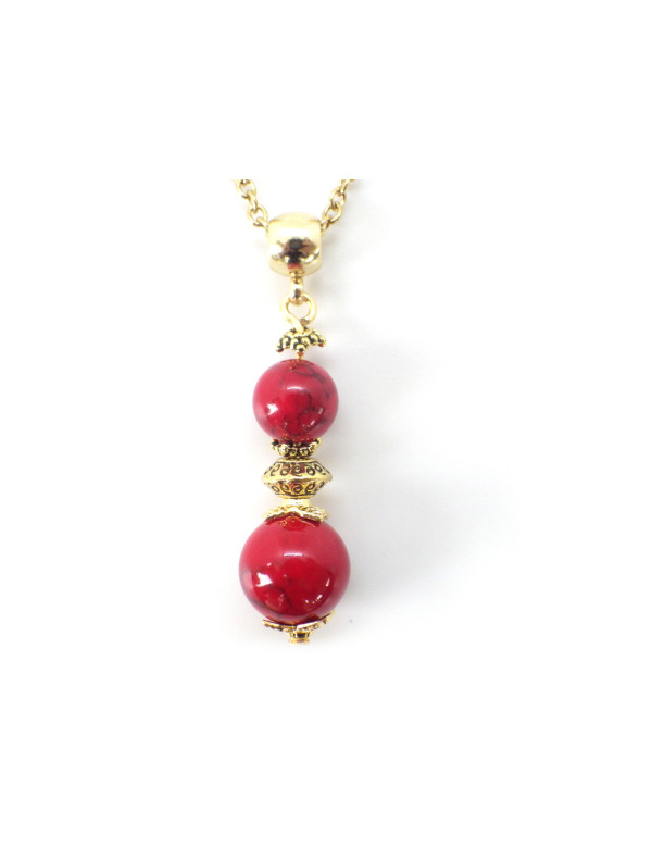 Style: Classic, Chic, Ethnic, Bohemian Pendant Height: 35 mm Necklace Length: 45 cm Beads: 10 mm and 8 mm Materials: Turquoise relocated red, brass, stainless steel Color: red Metal color: gold, gold
