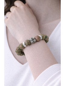A magnificent handcrafted creation presented by ThurColas Création, this is a bracelet for women made of natural green Unakite pearls (semi-precious stone) embellished with a central pearl set with crystals. The whole thing is mounted on a quality elastic wire. Style: Classic, Chic, Ethnic, Bohemian Length: 19 cm Beads: 10 mm Materials: Green Unakite (Semi Precious Stone), Silver Metal, Crystal Color: Green Metal Color: Silver