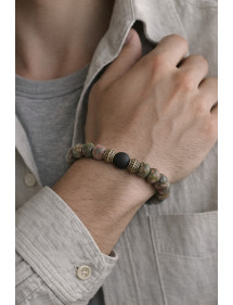 Very beautiful men's bracelet made with care in our workshops in France. This bracelet is made of beautiful natural green and brown unakite beads, black Agate beads and very pretty Tibetan beads in antique bronze brass. It is the strength of the metal that shines through in this model. Style: Ethnic, Bohemian, tribal, zen Length: 210 mm Beads: 10 mm Materials: unakite (semi-precious stone), black agate brass Color: green, brown, black Metal color: Antique bronze Superb bracelet composed of natural unakite (semi-precious stone) beads, black agate and Tibetan brass beads, all mounted on a quality elastic thread. This piece of jewelry comes with a free gold-colored gift bag.