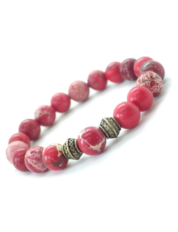 Very beautiful women's bracelet made with care in our workshops in France. This bracelet is made of beautiful natural red imperial jasper beads and very pretty Tibetan beads in antique bronze brass. It is the strength of the metal that shines through in this model. Style: Ethnic, Bohemian, tribal, Zen Length: 190 mm Beads: 10 mm Materials: imperial jasper (semi-precious stone), brass Color: red, Metal color: Antique bronze