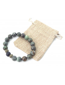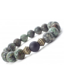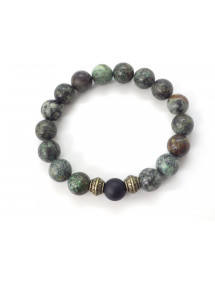 Very beautiful women's bracelet made with care in our workshops in France. This bracelet is made of beautiful natural turquoise beads, black Agate beads and very pretty Tibetan beads in antique bronze brass. It is the strength of the metal that shines through in this model. Style: Ethnic, Bohemian, tribal, Zen Length: 190 mm Beads: 10 mm Materials: natural turquoise (semi-precious stone), black brass black agate Color: green, black Metal color: Antique bronze