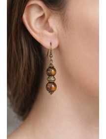 Power, elegance and protection come together in this handcrafted creation by ThurColas Création. Let yourself be seduced by these unique, carefully handmade earrings that combine the raw beauty of nature with a refined and timeless style. This creation highlights the famous semi-precious Tiger's Eye stone, recognizable among thousands by its shimmering reflections ranging from deep gold to caramel brown. Used since ancient times as a stone of protection, Tiger's Eye symbolizes inner strength, self-confidence, and mental clarity. Its captivating, almost living glow attracts light and attention. To enhance this iconic stone, the composition is enriched with finely engraved Tibetan beads and antique bronze brass cups, which frame the Tiger's Eye beads with subtlety and character. This mix of natural materials and handcrafted finishes creates a piece of jewelry that looks both mystical and elegant. The whole thing is mounted on brass French hooks, chosen for their resistance, comfort and delicate aesthetics. The antique bronze brass matches perfectly with the warm tones of Tiger's Eye, bringing a touch of vintage elegance to the jewel. With ThurColas Creation, express your inner strength through handmade jewellery, inspired by nature and full of symbols. Style: Classic, chic, Ethnic, Bohemian Crochet: French Height: 50 mm Beads: 10 mm Materials: brown Tiger's eye (semi precious stone), brass, antique bronze Color: brown Metal color: bronze Let yourself be seduced by the golden reflections and the protective power of tiger's eye with this pair of handcrafted earrings by ThurColas Creation. This jewel is entirely handmade in our workshop located in Anjou, by a passionate craftsman, who selects quality natural materials to create unique pieces, imbued with meaning and character. The pearls are made of real tiger's eye, a shimmering gemstone in brown, gold and copper tones. Native mainly to South Africa or India, tiger's eye is known for its virtues of protection, courage and self-confidence. Used since ancient times as a talisman, it acts as an energy shield while promoting clarity of mind and inner stability. The beads are mounted on a brass post and hooks made of antique bronze brass, a lightweight and durable metal, whose warm shades perfectly match the luminous reflections of the tiger's eye. As each pearl is natural, slight variations in color or pattern may appear, making each pair of earrings absolutely unique. The jewel comes with a free gift bag, ready to offer or keep in its beautiful case.