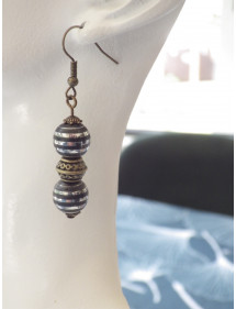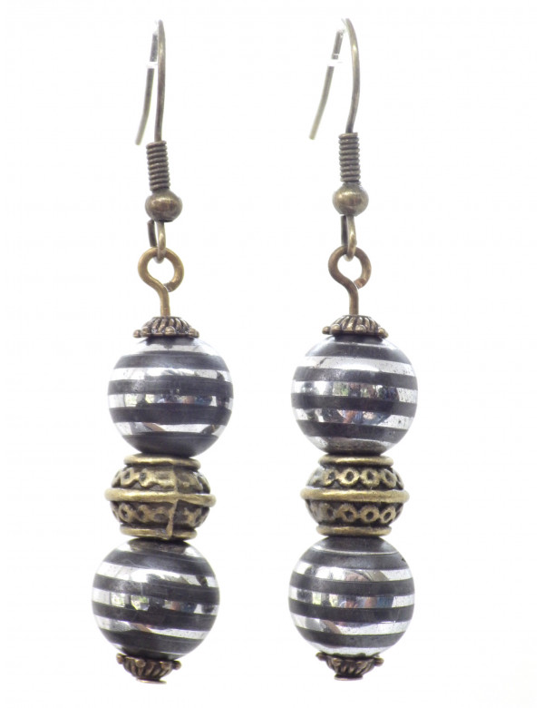 Immerse yourself in the metallic shine and magnetic elegance of black and chrome Hematite with this handcrafted creation by ThurColas Création. These unique earrings, entirely handmade, combine the brute force of natural stones with the finesse of a design designed to enhance the balance between light and depth. The star of this creation: black and chrome hematite, a stone with intense metallic reflections, where anthracite black meets almost mirror-like silvery sparkles. This enhanced version, with a more pronounced brilliance, gives the stone an assertive, almost cosmic presence. Hematite is renowned for its grounding, mental clarity and protection properties. Its chrome finish accentuates its power of concentration and refocusing, while reinforcing the modern and sophisticated appearance of the jewel. To highlight this vibrant stone, it is accompanied by finely crafted Tibetan beads and antique bronze brass cups, creating a subtle contrast between the polished metal of the stone and the patinated tones of the brass. The whole evokes the encounter between earthly matter and light, between inner solidity and external radiance. The mounting on brass French hooks ensures a comfortable fit and a stylish finish. Strong, light and durable, brass harmonizes perfectly with the metallic intensity of Hematite chrome, for a modern, structured and timeless look. With ThurColas Creation, wear a unique handcrafted piece of jewellery, crafted with passion, and let yourself be inspired by the magnetic and luminous power of black and chrome hematite. Style: Classic, chic, Ethnic, Bohemian Hook: French Height: 50 mm Beads: 10 mm Materials: Black Hematite and Chrome (semi precious stone), brass, antique bronze Color: black Metal color: bronze