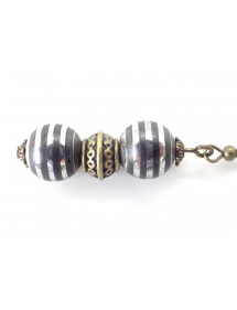 Immerse yourself in the metallic shine and magnetic elegance of black and chrome Hematite with this handcrafted creation by ThurColas Création. These unique earrings, entirely handmade, combine the brute force of natural stones with the finesse of a design designed to enhance the balance between light and depth. The star of this creation: black and chrome hematite, a stone with intense metallic reflections, where anthracite black meets almost mirror-like silvery sparkles. This enhanced version, with a more pronounced brilliance, gives the stone an assertive, almost cosmic presence. Hematite is renowned for its grounding, mental clarity and protection properties. Its chrome finish accentuates its power of concentration and refocusing, while reinforcing the modern and sophisticated appearance of the jewel. To highlight this vibrant stone, it is accompanied by finely crafted Tibetan beads and antique bronze brass cups, creating a subtle contrast between the polished metal of the stone and the patinated tones of the brass. The whole evokes the encounter between earthly matter and light, between inner solidity and external radiance. The mounting on brass French hooks ensures a comfortable fit and a stylish finish. Strong, light and durable, brass harmonizes perfectly with the metallic intensity of Hematite chrome, for a modern, structured and timeless look. With ThurColas Creation, wear a unique handcrafted piece of jewellery, crafted with passion, and let yourself be inspired by the magnetic and luminous power of black and chrome hematite. Style: Classic, chic, Ethnic, Bohemian Hook: French Height: 50 mm Beads: 10 mm Materials: Black Hematite and Chrome (semi precious stone), brass, antique bronze Color: black Metal color: bronze Shine with elegance and character with this pair of black and chrome hematite earrings, signed ThurColas Création. This jewel is entirely handmade in our workshop located in Anjou, by a passionate craftsman who combines know-how, natural materials and a sense of detail to create unique pieces full of presence. The pearls are made of genuine black hematite, chrome finish, a fine stone with a mirror polish, enhanced by a surface treatment that intensifies its metallic shine. Native mainly to Brazil or South Africa, hematite is known for its anchoring, protection and concentration properties. In this shiny version, it becomes a symbol of inner strength combined with a modern and assertive aesthetic. The beads are mounted on a brass rod and hooks in antique bronze brass, a metal that is at once strong, light and warm, whose contrast highlights the cold, chrome-plated reflections of the hematite. As each pearl is natural and then polished individually, slight differences in brilliance or shape may appear, making each pair of earrings unique, just like the stone itself. Your jewelry is delivered in a free gift bag, ready to offer or to treat yourself, for an attention that is as bright as it is symbolic.