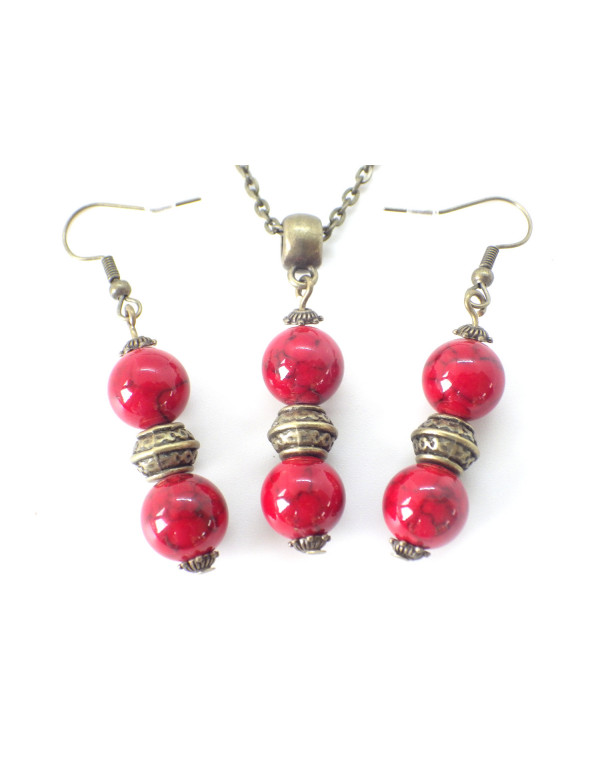 Bronze earring and necklace set with red-dyed reconstituted turquoise bead pendant and Tibetan beads