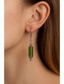 These handcrafted earrings captivate with the intense radiance of their green glass, capturing the light with refinement.