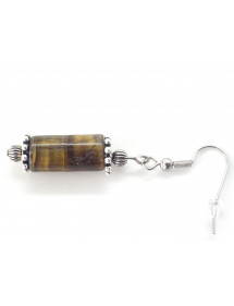 These tiger's eye earrings captivate with their shimmering brown and gold reflections, true bursts of natural light. A protective stone par excellence, tiger's eye is known to ward off negative energies, strengthen self-confidence, and promote clarity of mind. Its warm hues evoke strength, determination, and grounding. Each 30 mm cylindrical pendant is cut from a carefully polished natural tiger's eye, revealing its superb golden iridescence. The silver-plated brass beads and findings add a touch of sparkle, contrasting beautifully with the stone. The stainless steel hooks and posts ensure a comfortable, durable, and hypoallergenic fit. These earrings, handcrafted in our workshop in Anjou, combine elegance and protective energy. They pair equally well with a simple outfit as well as a natural or ethnic chic look. Each pair comes in a natural pouch, ready to give as a gift or to treat yourself. Materials: Natural tiger's eye pendant, silver-plated brass beads and findings, stainless steel hooks and posts. Total height: 50 mm Pendant height: 30 mm Stone origin: South Africa and India, deposits renowned for their shimmering golden reflections. Handcrafted in France, made in our workshop in Anjou.