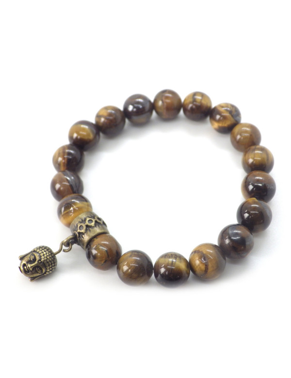 Natural South African Tiger Eye Bracelet with Bronze Brass Buddha Head - 10mm - 19cm