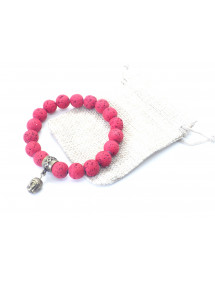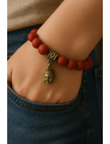 This bracelet features 10mm red-dyed lava stone beads hand-strung on durable elastic cord, with a brass Buddha head in an antique bronze finish. Its 19cm length fits a standard women's wrist. Each piece is handcrafted in France. This bracelet is made of 10mm red-dyed lava stone beads mounted on a 19cm elastic cord. It is handmade and made in our workshop in Anjou.