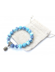 This bracelet is made of 10mm blue and purple dyed white jade beads from China, hand-strung on a durable elastic cord, with a Buddha head in antique bronze-finished brass. Its 19cm length fits a standard women's wrist. Each piece is handcrafted in France, in our workshop in Anjou, with special attention paid to materials and finishes. The blue and purple shades add a soft and original touch. This bracelet is made of 10mm blue and purple tinted white jade beads from China mounted on a 19cm long elastic cord. The manufacturing is handcrafted and carried out in our workshop in Anjou.