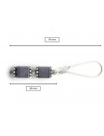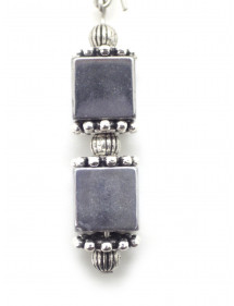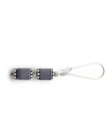 The earrings measure 70 mm in total length and 35 mm for the beaded section. They feature two square hematite beads in a chrome color, a natural stone from Brazil known for its steely gray hue and luminous reflections. The silver-plated brass bead caps are delicately beaded, subtly highlighting each bead. The earring hooks are elongated stainless steel hoops, ensuring comfort and durability. Each piece of jewelry is designed and handcrafted in our workshop in Anjou, France.