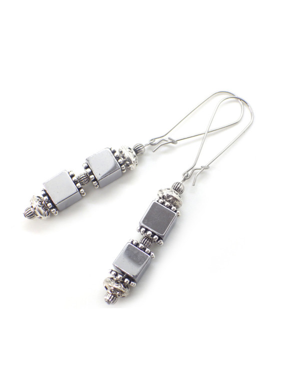 These earrings are distinguished by their elegant verticality and the deep brilliance of natural hematite. Composed of two polished cubes separated by openwork silver cups, they offer a subtle and refined play of light. The elongated stainless steel hooks accentuate their modern look and lengthen the face. Each pair is handcrafted in our workshop in Anjou, a symbol of French artisanal craftsmanship. A piece of jewelry that is both graphic and timeless, ideal for enhancing any outfit. These earrings are 80 mm long with a 45 mm beaded section. They feature two cubes of natural hematite from Brazil, a semi-precious stone renowned for its metallic luster and balancing properties. The decorative elements are made of silver-plated brass, and the elongated hooks are made of hypoallergenic stainless steel for a comfortable fit. Each pair is meticulously handcrafted in our workshop in Anjou, guaranteeing impeccable quality.