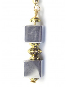 These elegant earrings combine the geometric simplicity of natural hematite cubes with the warm glow of gold-plated finishes. The cubic beads are framed by delicate, openwork gold-plated brass cups, suspended from 18K gold-plated hooks. Their refined design adds a chic and contemporary touch, perfect for enhancing a dressy or casual outfit. Each pair is handcrafted in our workshop in Anjou, France. This piece measures 50 mm in length. It is composed of two cubes of natural hematite from Brazil and openwork cups in gilded brass. The clasps are 18K gold-plated stainless steel hooks, durable and comfortable to wear. A French handcrafted jewel, made with care and precision in our workshop in Anjou.