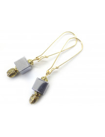 These refined earrings combine the metallic depth of natural hematite with the warmth of gold. Finely crafted beads frame a hematite cube, creating an elegant and timeless contrast. Mounted on elongated gold hoops, they offer a fluid and harmonious drape. Each pair is handcrafted in our workshop in Anjou, guaranteeing authenticity and artisanal quality.
