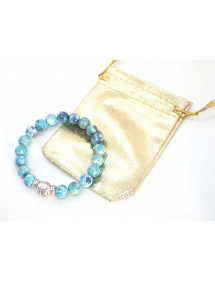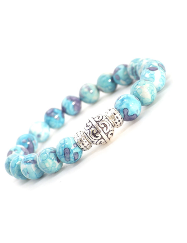 Very pretty men's bracelet with a central silver-plated brass bead. Carefully made in our workshops in France, this bracelet is made up of magnificent natural white jade beads tinted in blue and purple and a very pretty central silver-plated brass bead with volute patterns. This model highlights its vintage and ethnic style. Style: Ethnic, Bohemian, tribal, zen Length: 210 mm Beads: 10 mm Materials: hematite (semi-precious stone), silver-plated brass Color: blue, purple, white Metal color: Silver Magnificent bracelet composed of natural white jade beads tinted in blue and purple (semi-precious stone) and central silver-plated brass bead, all mounted on a quality elastic wire. This piece of jewelry comes with a free gold colored gift bag.