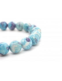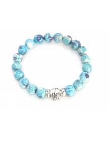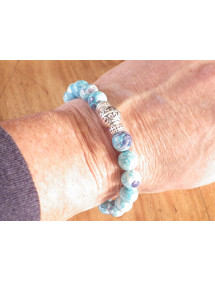 Very pretty men's bracelet with a central silver-plated brass bead. Carefully made in our workshops in France, this bracelet is made up of magnificent natural white jade beads tinted in blue and purple and a very pretty central silver-plated brass bead with volute patterns. This model highlights its vintage and ethnic style. Style: Ethnic, Bohemian, tribal, zen Length: 210 mm Beads: 10 mm Materials: hematite (semi-precious stone), silver-plated brass Color: blue, purple, white Metal color: Silver