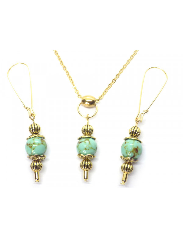 Gorgeous vintage gold plated stainless steel choker necklace and earrings set. Handcrafted, this jewelry set is made with care and made of blue reconstituted turquoise with gold metal and gold-plated stainless steel. Everything is mounted on a gold-plated stainless steel chain for the necklace and on gold-plated stainless steel hoops for the earrings. Style: Bohemia, Vintage Clasp: carabiner, lobster claw Length of necklace: 45 cm Height of earrings: 70 mm Beads: blue reconstituted turquoise Materials: gold metal and gold-plated stainless steel Colour: blue Metal colour: gold, Golden The pearls of this jewelry set are in reconstituted turquoise, dyed and assembled on a stainless steel rod, the dyeing process being random, each pearl is unique in color so there may be slight differences with the model presented, each model is in fact unique. This jewel is delivered in a gift box.