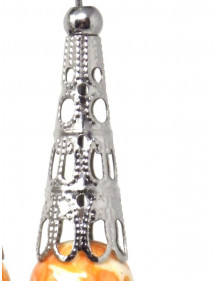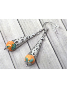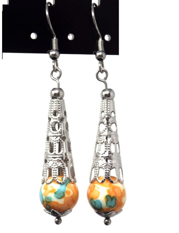Ladies stainless steel earrings with filigree steel cone and Jade pearls tinted in orange and blue