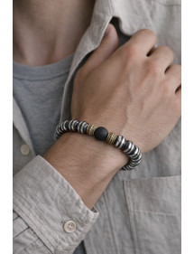 Beautiful men's bracelet in semi-precious stone. Made with care in our workshops in France this bracelet is made with black and gray hematite beads and three central Tibetan beads in antique silver-colored alloy. Style: Ethnic tribal bohemian hippie chic Length: 210 mm Beads: 8 mm Materials: Hematite (semi-precious stone) Color: black gray Metal color: Antique silver