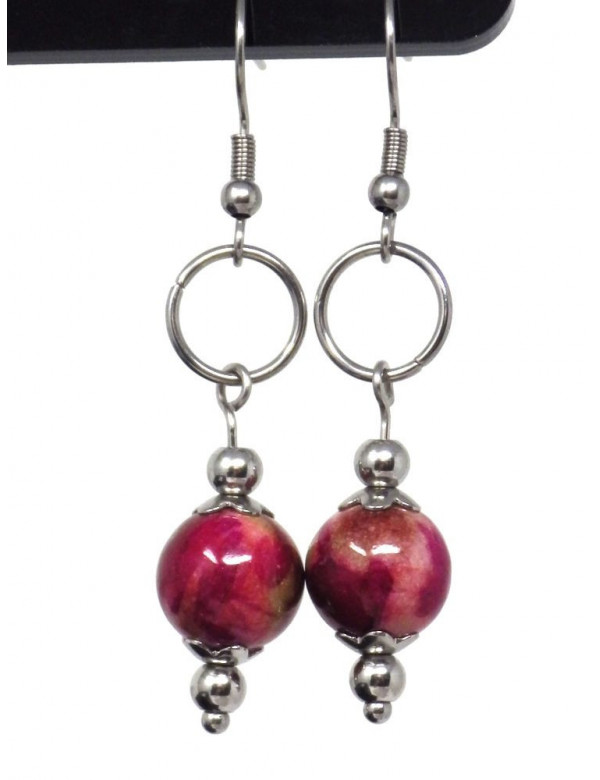 Women's stainless steel earrings with rings and Jade pearls tinted in red and shades of green