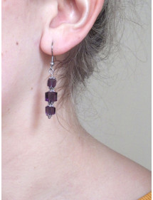 Beautiful purple style earrings for elegant women. This precious jewel is made with purple glass square beads, the metal parts, especially the hooks and the stem are made of stainless steel, the cups are silver plated brass. The dominant color of the earrings is purple. The glass beads are 6 and 8 mm, the height of the earrings is 50 mm.