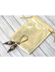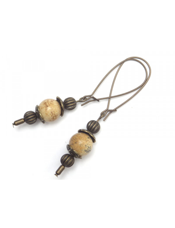 Beautiful Vintage earrings in antique bronze. Handcrafted, these earrings are made with care and composed of brown jasper (semi precious stone) and antique bronze. Everything is mounted on fancy antique bronze hoops. Style: Bohemia, Vintage Hook: Dormeuse, hoops Height: 60 mm Beads: brown jasper (semi precious stone) Materials: antique bronze Color: brown Metal color: Antique bronze Our beads are made of real jasper and assembled on a bronze rod, jasper being a natural stone, each bead is unique in color so there may be slight differences with the model presented, each model is in fact unique. This jewel comes with a free gold-colored gift pouch.