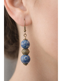 Magnificent Vintage Necklace and Earring Jewelry Set in Antique Bronze. Handcrafted, this set of jewelry consisting of a necklace with pendant and creole earrings is made with care and composed of lapis lazuli (semi precious stone) and antique bronze. Everything is mounted on a chain and fancy antique bronze hoops. Style: Bohemia, Vintage Necklace clasp: lobster claw hook earrings: creole Pendant height: 30 mm Earring height: 60 mm Chain length: 43 cm Beads: lapis lazuli (semi precious stone) Materials: antique bronze Color : Blue Metal color: Antique Bronze Our beads are in real lapis lazuli and assembled on antique bronze colored brass metal, lapis lazuli being a natural stone, each bead is unique in color so there may be slight differences with the model presented, each model is made unique. This jewel comes with a gift box.