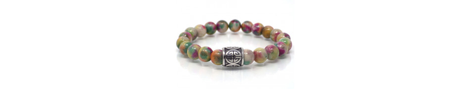 €23.67Beautiful green tribal style bracelet for men made with natural white jade pearls tinged in green, red, white and brown. The dominant color of the bracelet is green. This bohemian style men's bracelet is embellished with a beautiful stainless steel center bead with interwoven patterns and two stainless steel spacer beads. The beads are 10 mm in diameter and the bracelet is 21 cm long. Thurcolas is a French creative workshop specializing in the artisanal manufacture of jewelry. All our jewelry, bracelets, earrings, necklaces and anklets are handmade in France with quality materials.