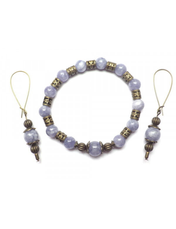 Magnificent Vintage bracelet and earrings set in antique bronze. Handcrafted, this set of jewelry consisting of a bracelet and creole earrings is made with care and composed of blue quatz (semi precious stone) and antique bronze. Everything is mounted on a quality resistant elastic and fancy antique bronze hoops. Style: Bohemia, Vintage hook earrings: hoop Earring height: 60 mm Bracelet length: 19 cm Beads: blue quartz (semi precious stone) Materials: antique bronze Color: Blue Metal color: Antique bronze Our beads are genuine blue quartz and assembled with antique bronze colored brass metal, blue quartz being a natural stone, each bead is unique in color so there may be slight differences with the model presented, each model is made unique. This jewel comes with a gift box.